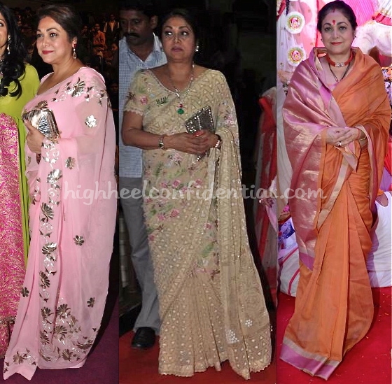 Its lack of effort that makes all three looks do nothing for her . Under eye dark circles not hidden properly , hair not dyed properly ,sari not worn that well and jewellery plus sari could have been much better considering the money at disposal. I feel sad for her thinking that she could lookso nice and yet she ends up looking like this.