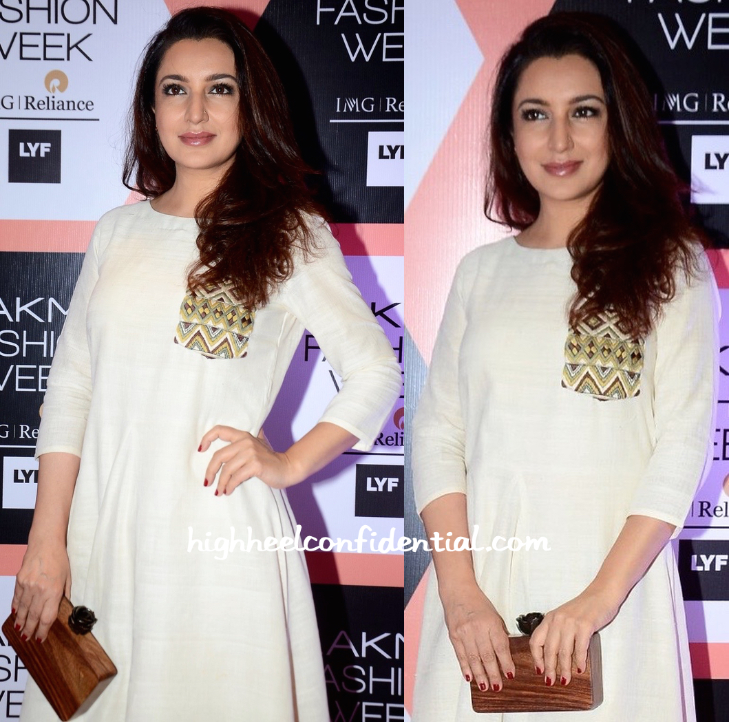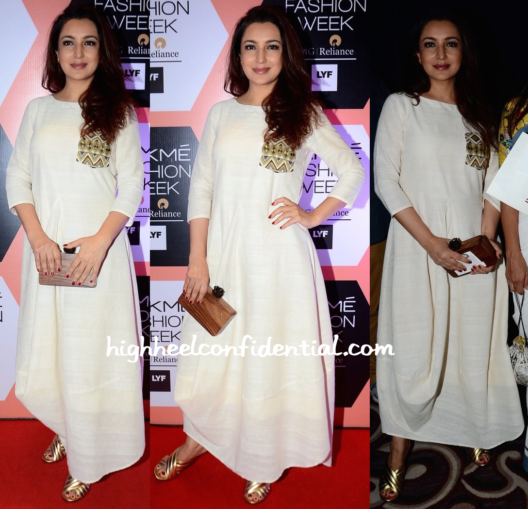 Tisca was photographed at the ongoing Fashion Week in a Purvi Doshi dress. Eina Ahluwalia earrings, a box clutch and Gucci heels were her accessories of choice. She looked nice.