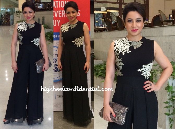 Tisca, who’s tied up with Times Of India’s food safety initiative, attended an event for it in Bengaluru wearing a Ridhi Mehra jumpsuit. Picking up on the grey floral embroidery, she finished out her look with a metallic clutch and sandals adding pink lip to give the look a bit of color.