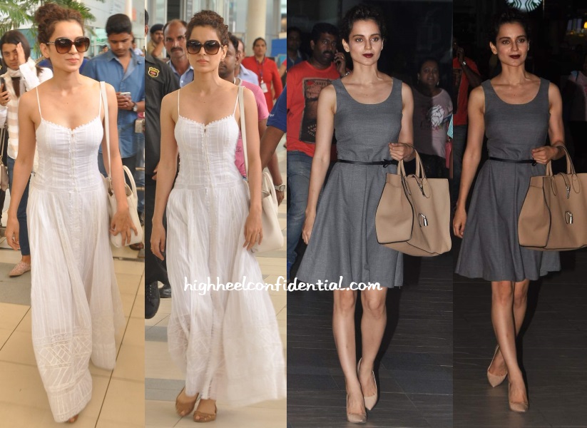 Ms. Ranaut headed straight back to Mumbai after receiving her National Award in Delhi sporting a grey dress with her Gucci Jackie tote and sticking to the hairdo and make-up from earlier in the day.