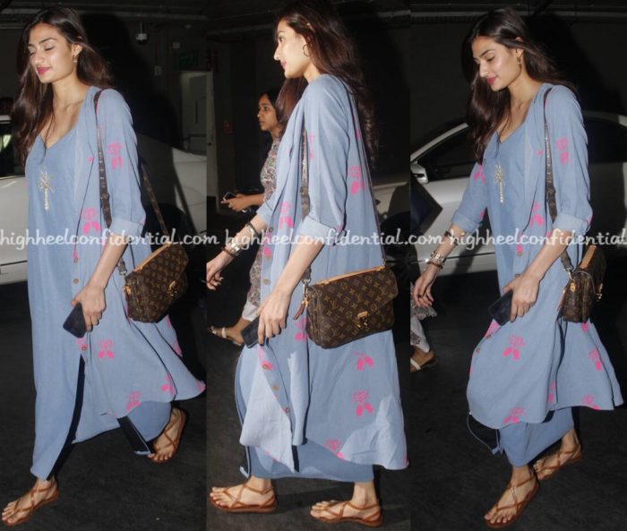 As she headed out of the airport, Athiya was photographed in Masaba separates. A Louis Vuitton ‘Pochette Métis’ monogram bag and pair of strappy flats rounded out the actor’s easy, off-duty look. She wore it all well!