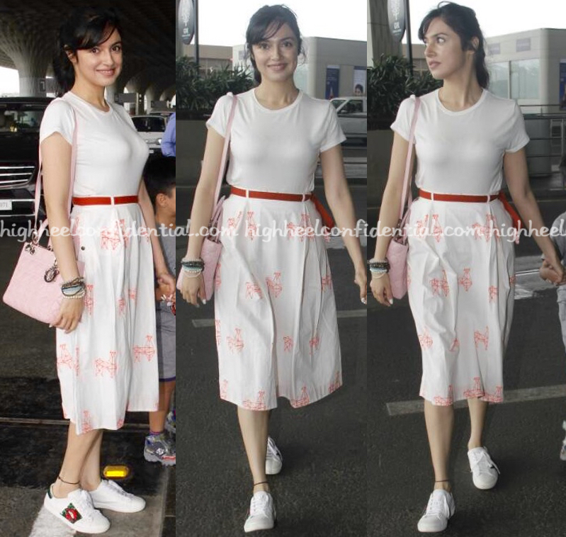 Pairing her printed skirt from Hathi with a Zara tee, Divya was photographed as she headed in to the airport. Her choice of accessories included a Dior bag and Gucci sneakers. On board with Ms. Khosla’s travel style?