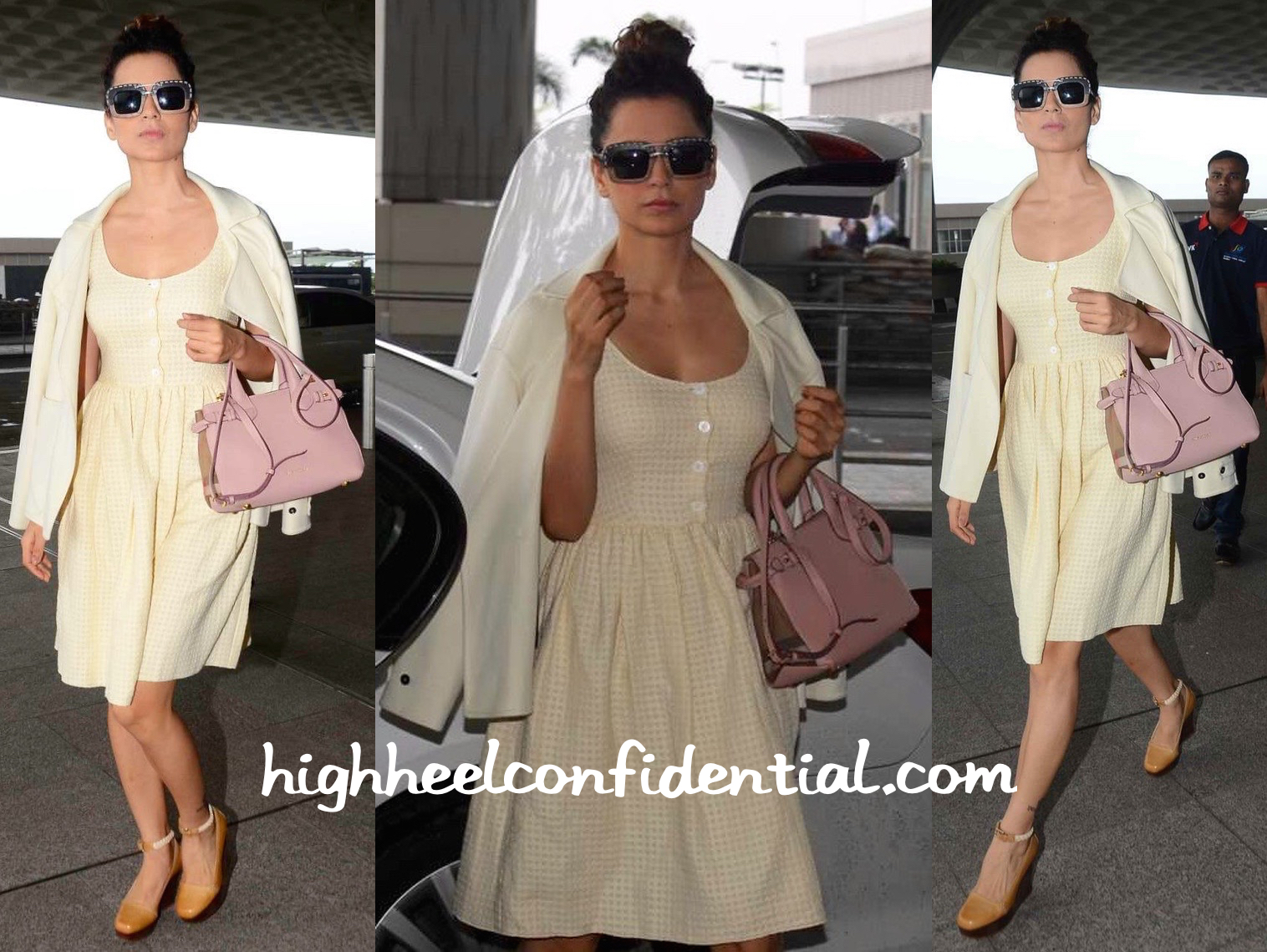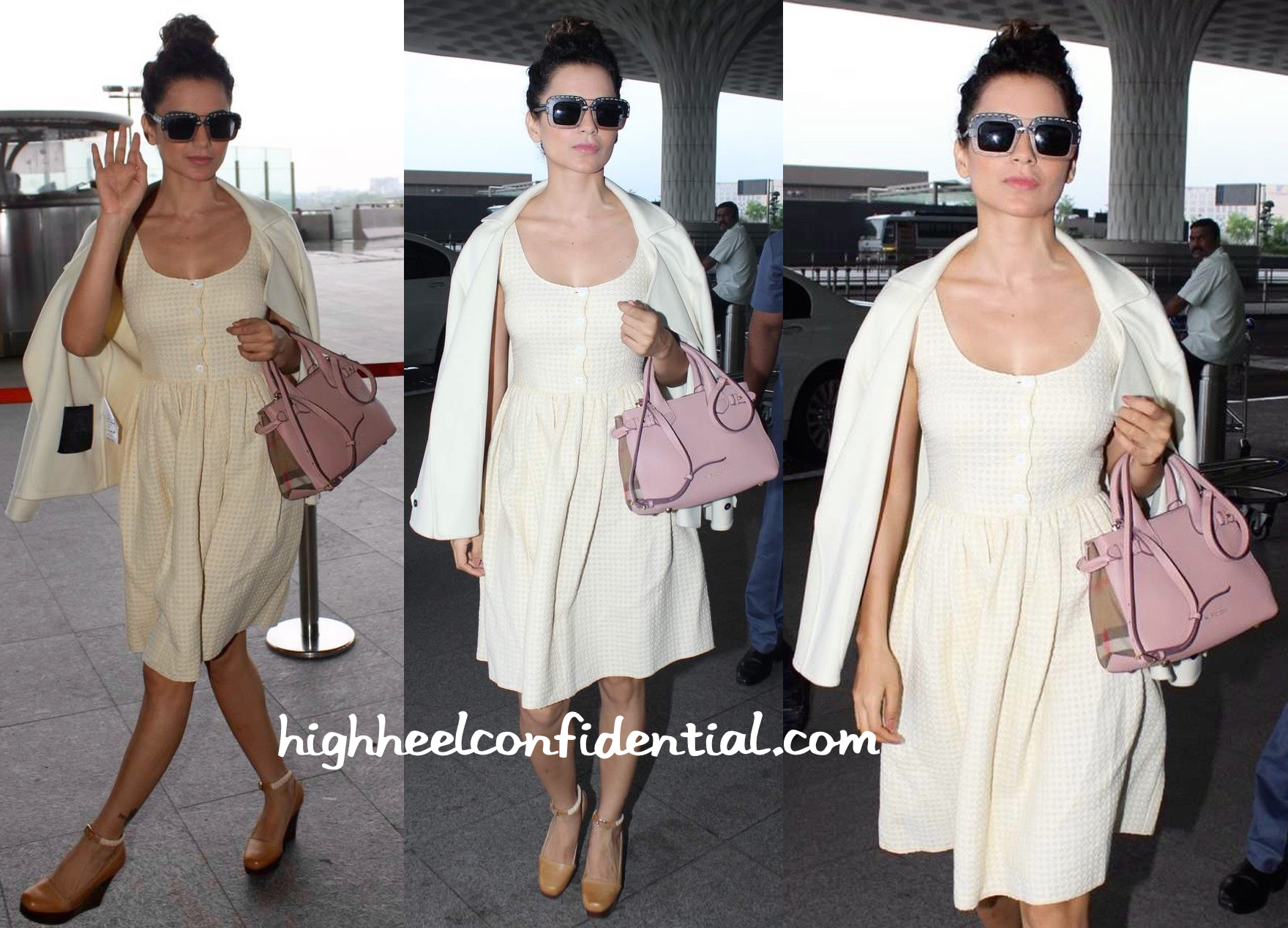 Looking every bit the movie star she is, Kangana was photographed at the airport wearing a Prada dress with matching pastel Burberry jacket draped around her shoulders. With her hair in a top knot, the actor finished out the look with glasses and ankle-strap wedges, both from Prada and a Burberry bag. She looked good!