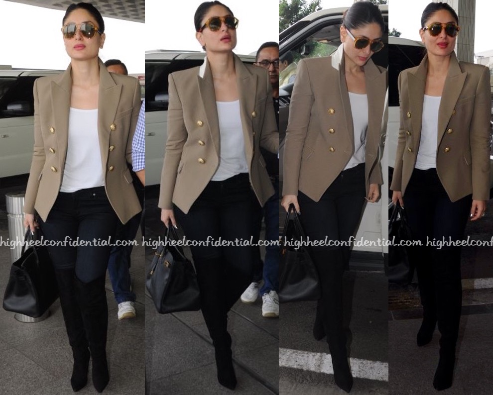 Topping off the classic white tee-blue denim combo with a camel Balmain blazer, Hermès bag and pair of suede knee-high boots, Kareena jetted out of Mumbai with family in tow.