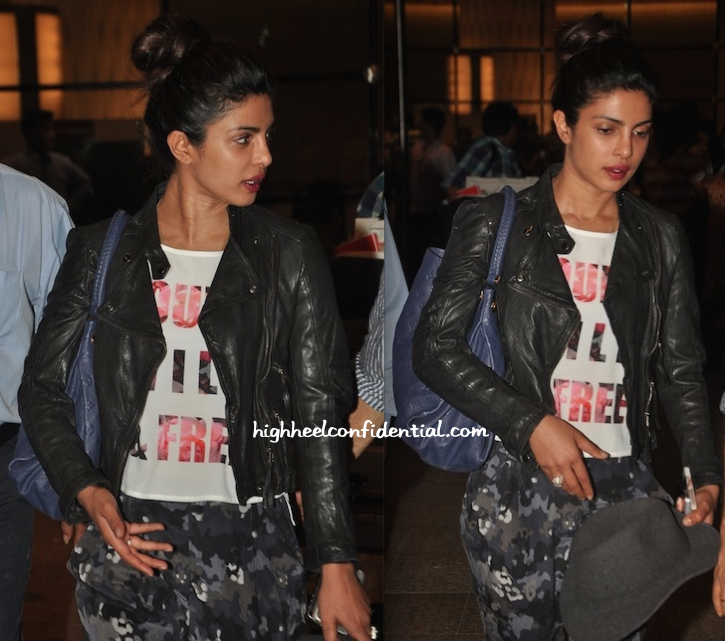 You can always count on Ms. Chopra to give us interesting travel gear. A recent sighting had her in a graphic tee, leather jacket and camouflage pants. And a felt hat, high-tops, top knot and Louis Vuitton bag were accessories of choice! You like?