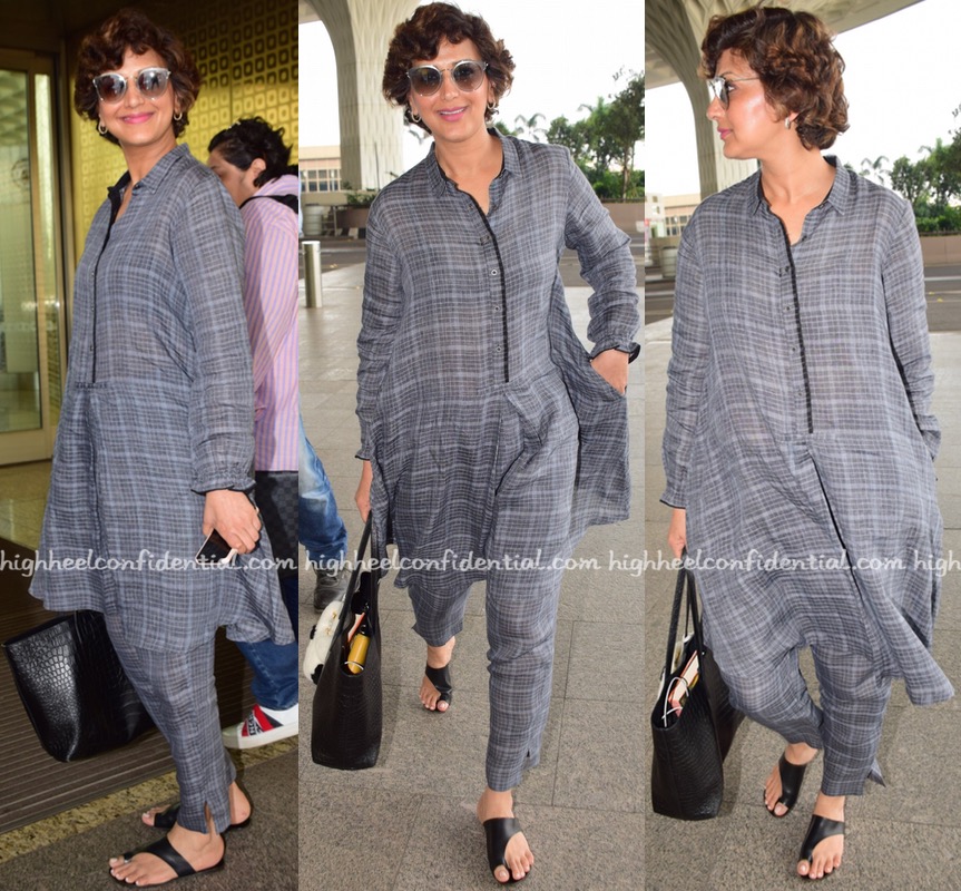 As she made her way in to the local airport, Sonali was photographed in matching grey separates that she teamed with black accessories. She made the easy off-duty look work!