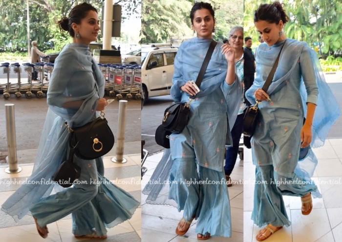 For a recent spot of travel, Taapsee picked a blue suit, one that she teamed with silver jewelry, a cross-body bag and pair of easy flats. Nothing to fault here, her off-duty look works!