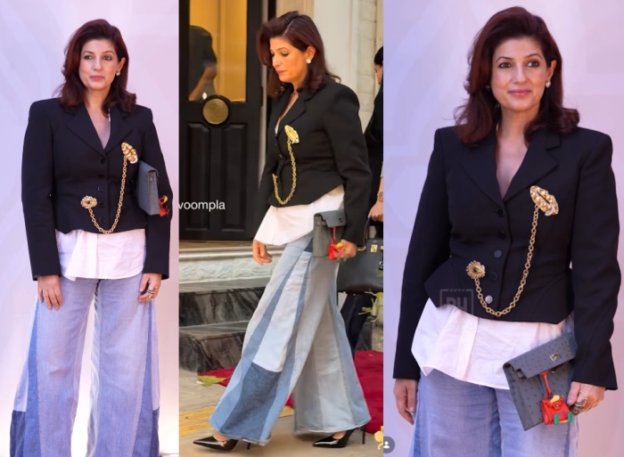 Twinkle attended a jewellery related event wearing a cropped jacket with a shirt, a Schiaparelli brooch, an Hermès Kelly ostrich clutch and flared denims. I find the different colored patches on the denim too casual and doesn’t quite work with the top half of the outfit.