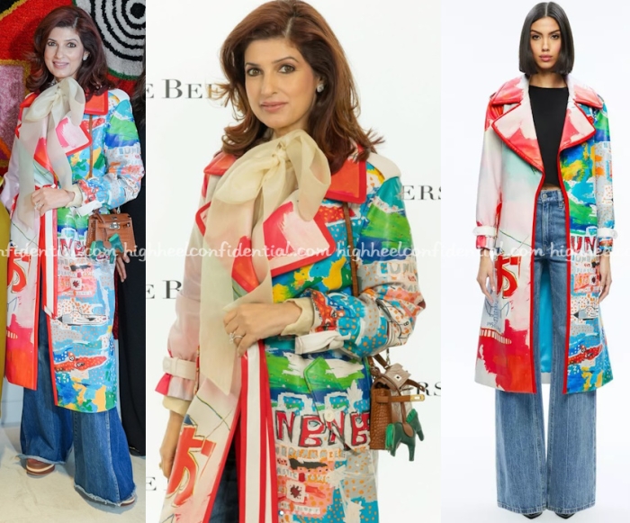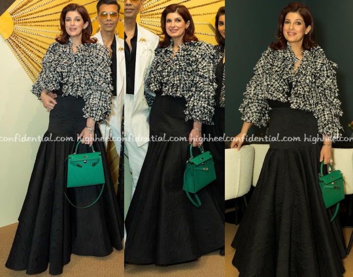 Twinkle attended two events hosted by a diamond brand in London first wearing an Alice + Olivia jacket featuring a Basquiat print with denims, a bow blouse and an Hermès mini Kelly. The second event saw her in a custom tweed-ish jacket and skirt look from Jade paired with an emerald green ostrich Hermès Kelly 25.