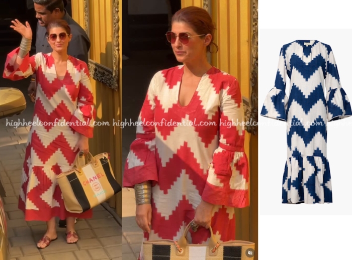 Twinkle was spotted arriving back in Mumbai wearing an ikat flared sleeve dress from DeCastro paired with a silver cuff, Hermès Oran sandals and a Chanel tote. The dress sure was cute.