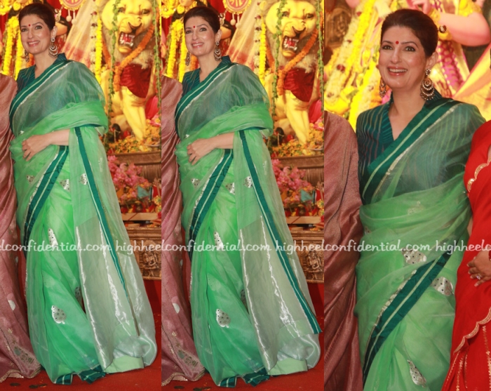 Twinkle attended Durga Puja celebrations on Tuesday evening wearing a green sari from Raw Mango paired with chaand bali style earrings. She looked lovely in it.