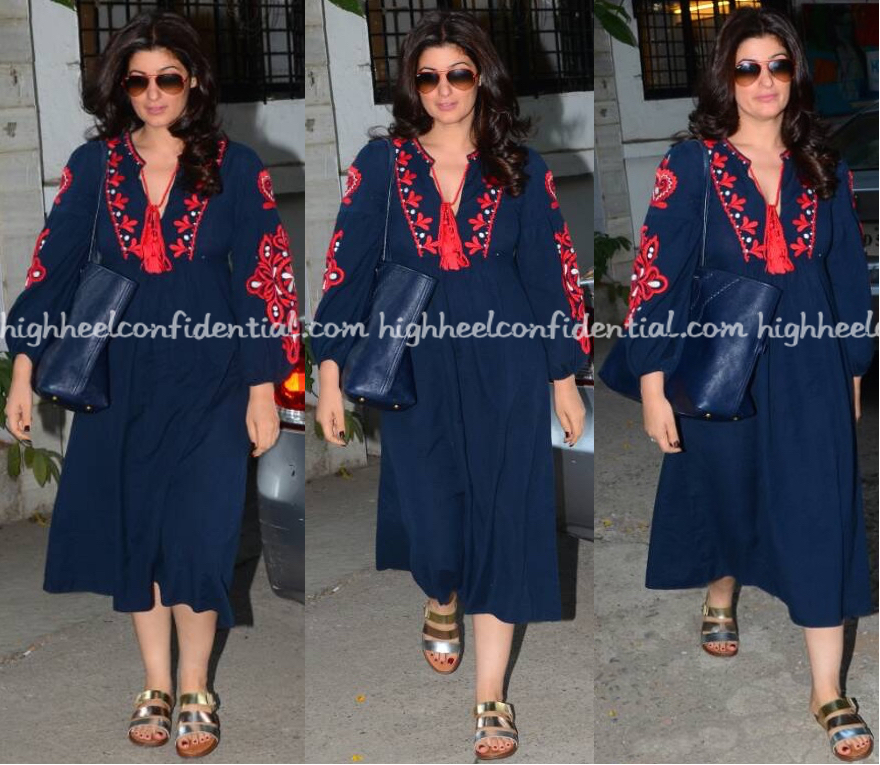 Keeping it easy and casual in a Zara midi dress, Twinkle was photographed as she was out and about in Mumbai. A navy tote and metallic sandals were among her accessories of choice. She wears her off-duty look well.