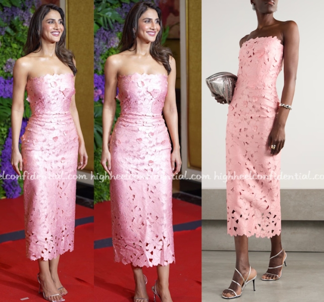 Vaani was seen at a production house’s celebration party in a strapless pink dress from Costarellos paired with minimalist silver slingback sandals. She looked great in it!