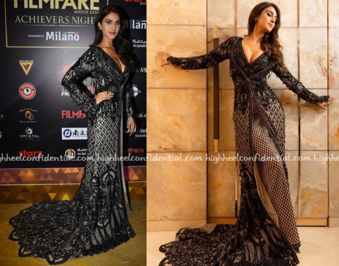 Wearing a Faraz Manan gown and coat, Vaani attended the Filmfare Middle East Achievers Night in Dubai on Saturday evening. I didn’t like the gown one bit. Did you?