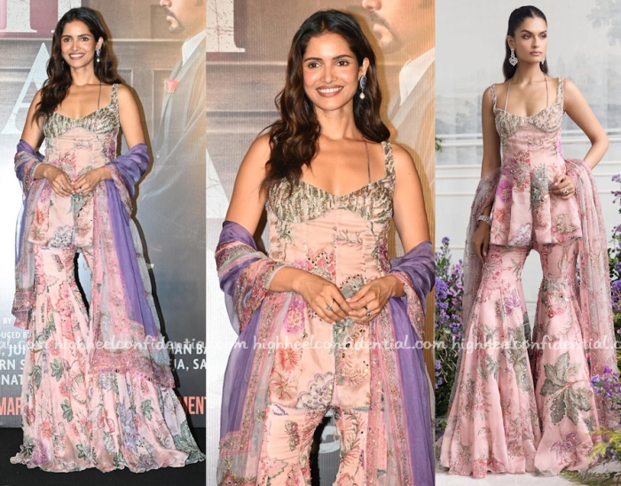 Vartika attended the trailer launch of her movie wearing a printed pink sharara from Mahima Mahajan. She looked nice but something about the top was giving of bad tailoring vibes.