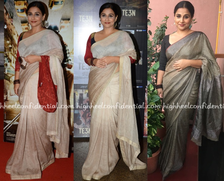 I think Vidya looks really pretty in both sarees. The make-up in the cream one could have been better. I really don’t care what Vidya wears because she is such a brilliant actress with a great personality which shines through despite what she’s wearing. I love that she wears Indian clothes, especially sarees that are not the usually blingy Bollywood kind. I think some of the negative comments say more about the classist, casteist nature of the commentators rather than Ms. Balan.