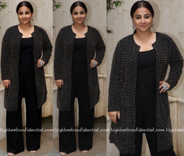 Wearing Abraham and Thakore, Vidya helped promote her latest movie at an event in Mumbai. With her hair pulled back, she rounded out the look with jewelry from Moha by Geetanjali. She looked nice. But, the look would’ve been a whole lot more impactful had she chosen a softer do and skipped that chunky ring and opted for just oversized earrings instead.