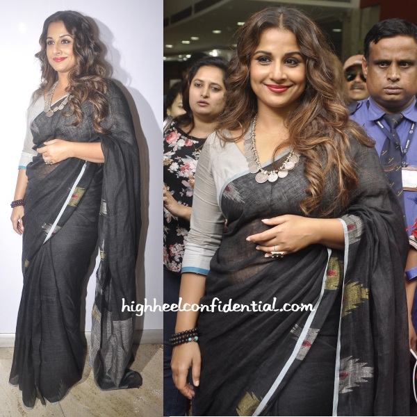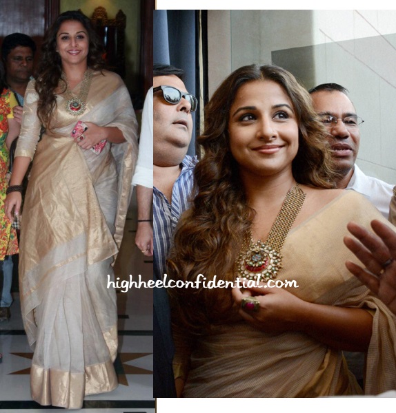 Two back to back promotional appearances for HAK saw Ms. Balan in her signature look: a simple sari, a rudraksha beads bracelet and a statement necklace.