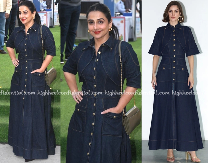Vidya attended the Annual Day function at a school wearing a denim dress from Ani Clothing with a chain bag and black pointed pumps. She looked good in it.