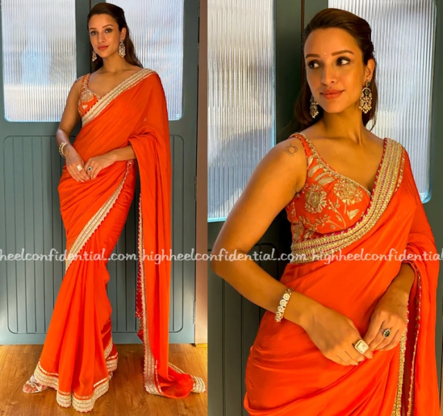 Catch Tripti in an orange version of the sari inside.