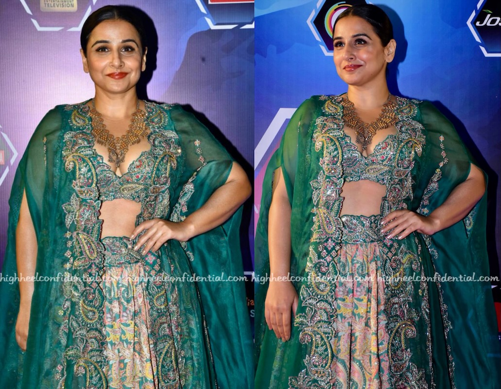 Wearing a Mrunalini Rao lehenga, Vidya attended an Awards event held not too long ago. With her hair pulled back in to a knot, she rounded out the look with an Amrapali necklace.