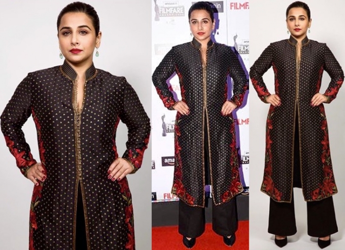 Vidya picked Rohit Bal to wear to an awards event held back in February. Her accessories for the evening included black pumps and jewelry by Atul Jewellers. As much as I like the silhouette on her, can’t say I was the biggest fan of the outfit itself. You?