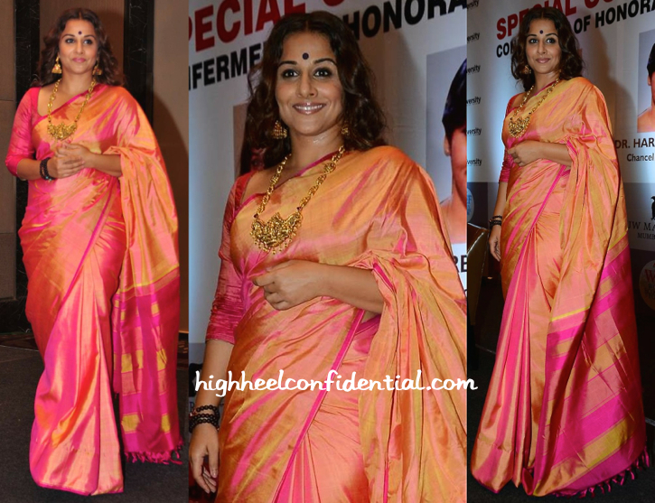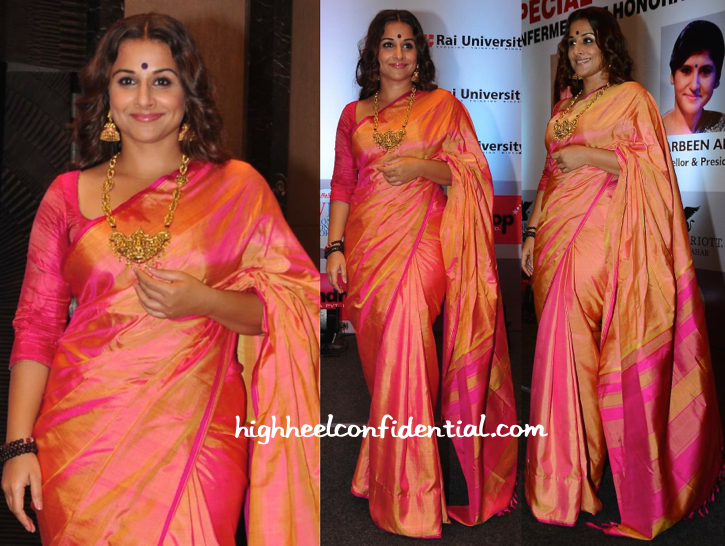 Wearing a silk sari with temple jewelry, Vidya attended a ceremony yesterday where she was awarded an honorary doctorate by Rai University. She looked lovely! (The jewelry felt excessive for the event in question, but it didn’t take away from the fact that she did look nice.)