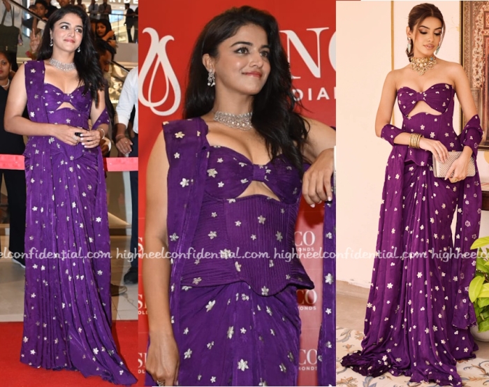 Wamiqa attended an event for a gemstone company wearing a corset and pre-stitched sari set from Karishma and Ashita. The whole cutout design of the bra and corset was weird to me and there were slight fit issues as well.
