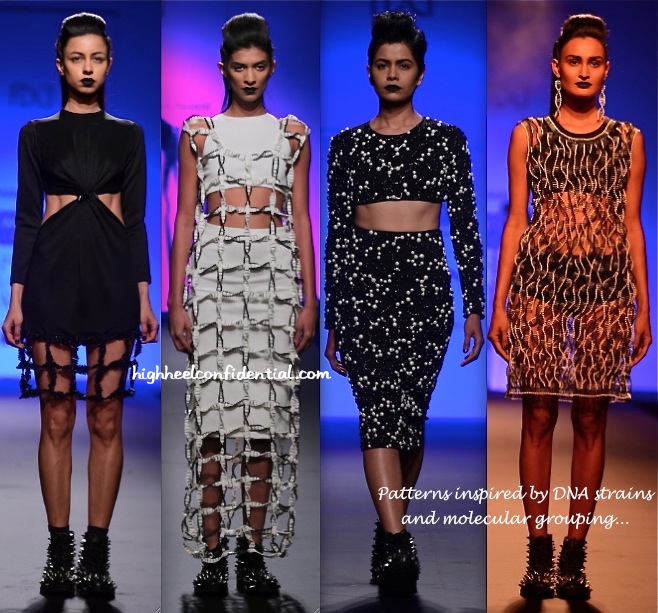 DNA and molecules? Could there be a more sophomorish theme to be inspired by? I bet every fashion/ print design student in the world has designed a collection around that at some point or other. Notice, I said “student” not established designer.