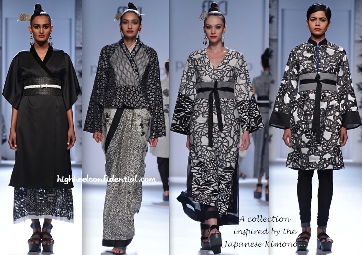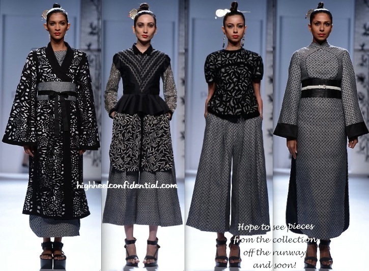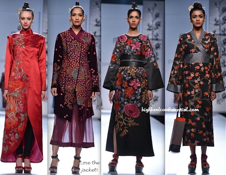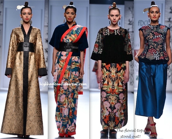 I like just one piece here – the cropped palazzo pants – 3rd row, 3rd from left. The sari mix in here is ghastly – last row, 2nd from left. Most traditional kimonos seem so graceful, but the designer manages to suck out all the grace from these “inspired” looks.